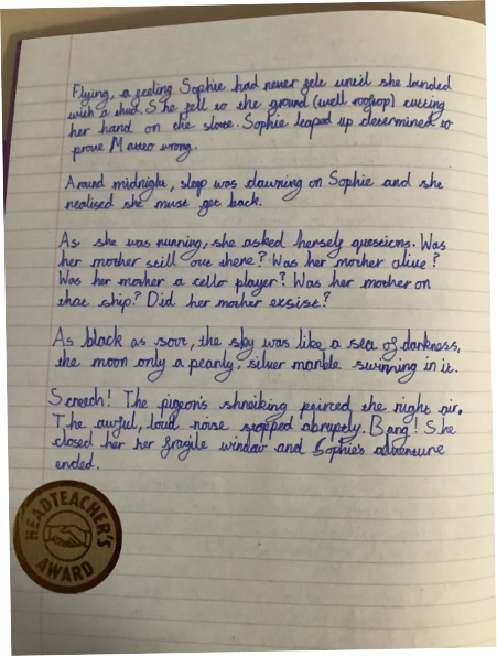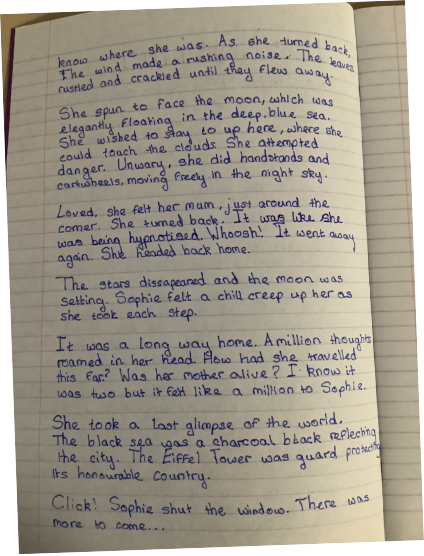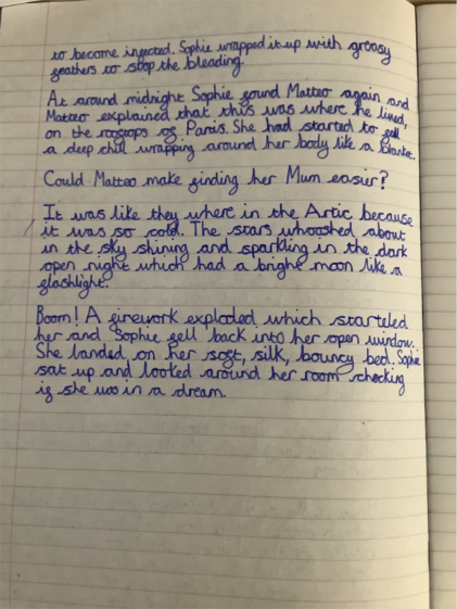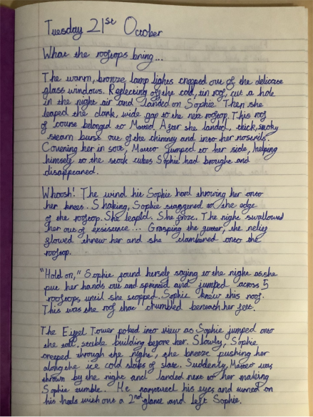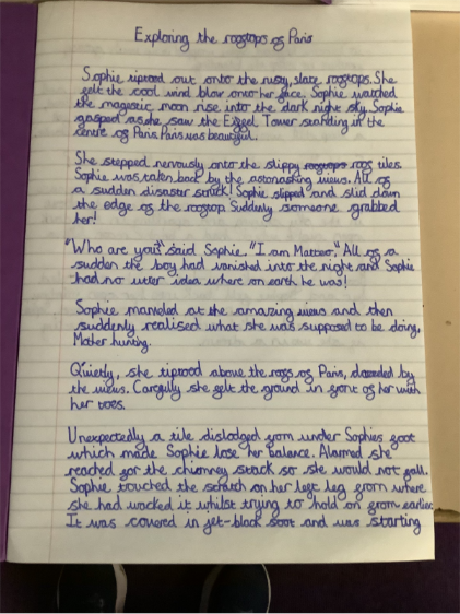Year 5 – In Year 5 we have been reading the novel ‘Rooftoppers’. It is the story of Sophie’s journey to find her missing mother. Part of her adventure involves exploring the rooftops of Paris. As part of our culminating activity for the novel, pupils created their own descriptions of Paris. They did a lovely job and Miss Robinson hopes to enjoy reading their original tales.